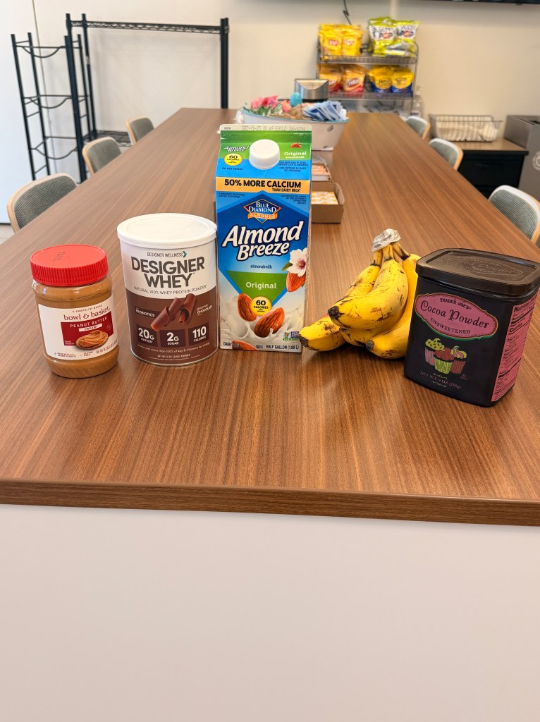 - Add the banana, cocoa powder, whey protein, and peanut butter